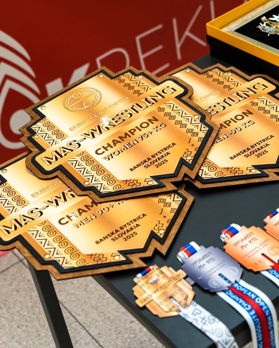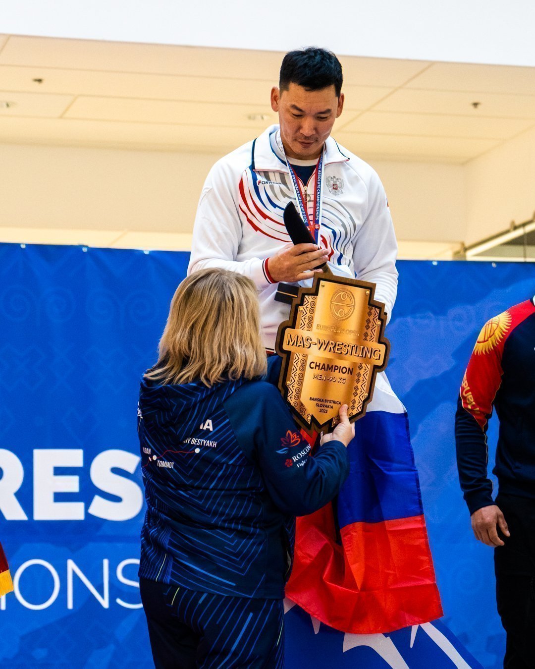 Трофеями абсолютных чемпионов Европы стали щиты победителей спортивных сражений и символ духа леса и охоты из серебра и латуни. У якутского народа с охотой связано немало традиций, обрядов и поверий. Удача охотника зависит от духа Байаная, которому поклоняются мужчины народа саха. Остальным призерам достались серебряные изделия якутских мастеров с символикой мас-рестлинга.
