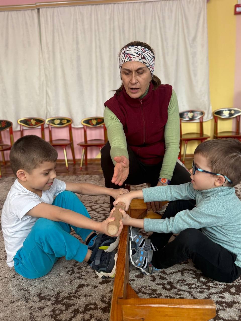 Родители обещали сделать детский помост для соревнований, в которых примут участие не только дети, но и родители. А пока мы проводим тренировки с упором ноги в ноги или используя вместо помоста перевернутую лавочку.